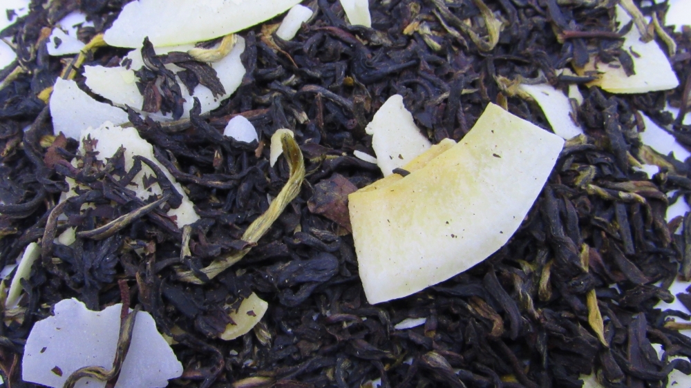 It starts with a blend of black teas (Yunnan & Assam) & then I add just a teensy bit of Lapsang Souchong. Just enough to add a pleasant smokiness to the blend without it overwhelming it. Then I add a bunch of coconut. The sweet, creamy flavor of the coconut combine with the smokiness & the nicely round, bold black tea flavors is quite delightful, if I do say so myself!